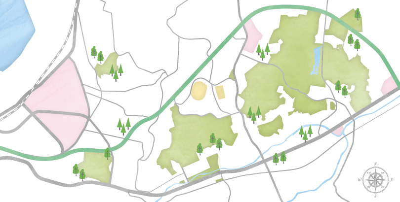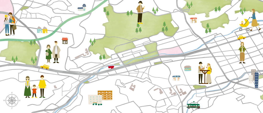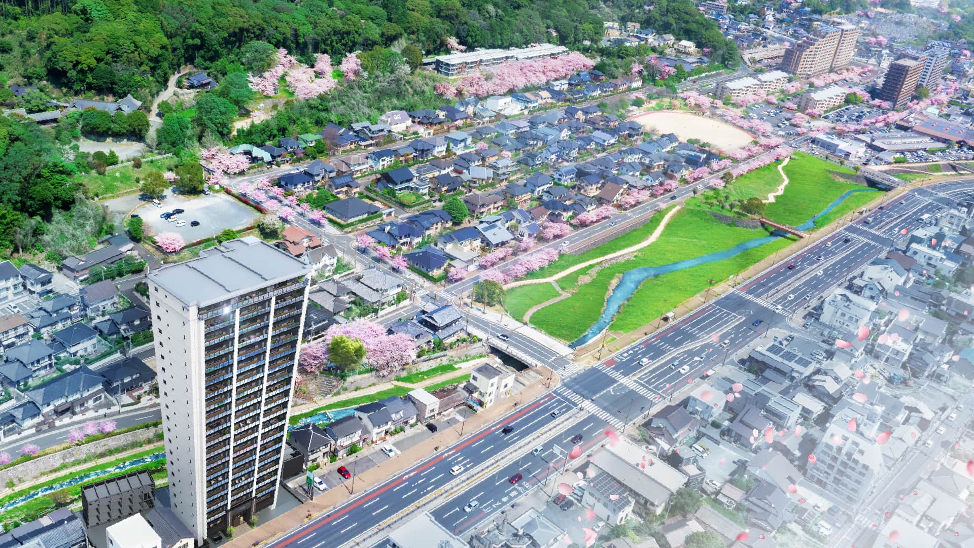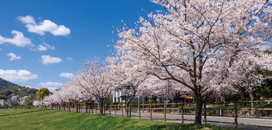 豊かな自然環境と、美しく整備された街並みが続く高見エリア。桜の名所として春には道路沿い、河川沿いに様々な種類の桜を楽しむことができます。街全体が桜に包まれる、芸術的な風景が広がります。